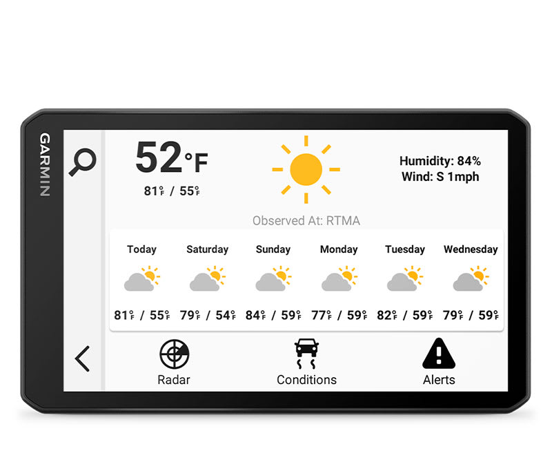 The Garmin Drive smartphone app and your compatible smartphone give you access to current weather conditions, smart notifications and traffic — keeping you in the know when you’re on the hunt.